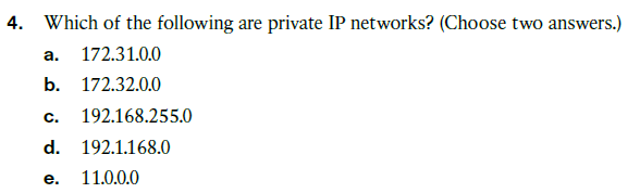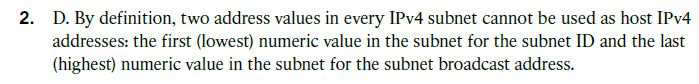 I would say C but I read the question and assumed it was ‘out of my ballpark’ because I saw math and then read the answer and was like ohh yeah thats in my mode of thinking so I saw the answer was D. Then was like ‘thats not what I would have thought’ then I was like ‘the subnet ID is not a static address in a subnet, why would have picked C’ then realized that D has that in it. I don’t know why the DG wouldnt be in the same subnet. I guess it doesn’t have to be, so ok. I’m really feeling slightly dumb for messing this one up. I still hate ‘broadcasting’ addressing for some reason because the only thing its used for is pushing software or updates. I’n which case im slightly unclear on how a router is smart enough to duplicate a packet to every fucking machine in a subnet thus reducing the overall amount of bandwidth required for mass updates from like a WSUS server. Which is basically all I’m doing these days lol … youll never guess how we do this … manged windows updates? Not needed but boy would I like to manage making sure clients are up to date with all the important stuff. lol anyway…..