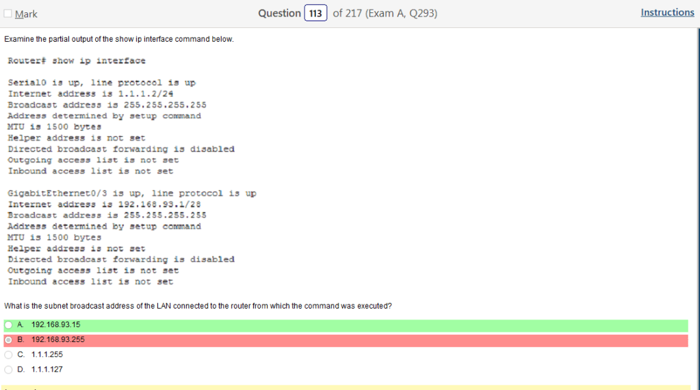 Which flows great into this next question. Why I picked the .255 address is beyond me but in a /28 there are 14 hosts and you have to have a broadcast address which would be the .15 in this case.