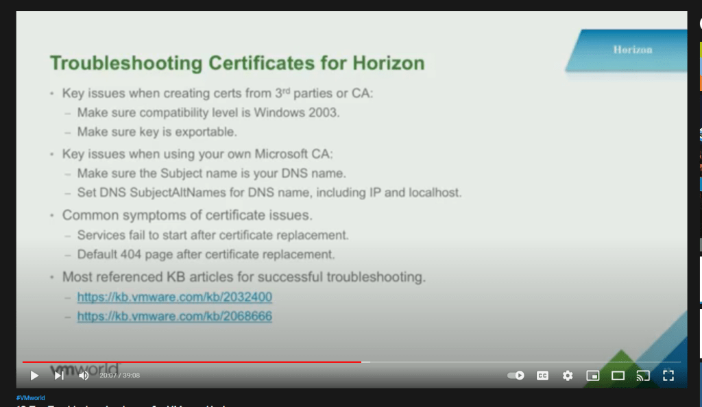 So — these are rough notes I’m taking here as I’m watching this. First of all, I’m fairly certain this guy has not fielded a bunch of end user day to day troubleshooting issues but is -maybe- working tickets that get sent to VMWare or he may, simply be a speaker. Now that’s out of the way, I’ve noticed that not once has he mentioned applications not working within the VM or, as noted printers! pass through devices of any type can be tricky to troubleshoot but I promise, end users are not going to call because their single desktop was broken because of a cert issue. Every dang VDI in your infra is going to be broken. He mentions that there are various ways to connect and that could play a factor like if you have a non D joined machine — connecting via VPN with lan creds — and then launching the VM, the performance could be different. …because of the modem. That also rolls into my number 8 item, his 2. It’s possible but if you have that poorly designed of a wifi network you should probably reimplement it. Unless they are — connected to the guest network.
