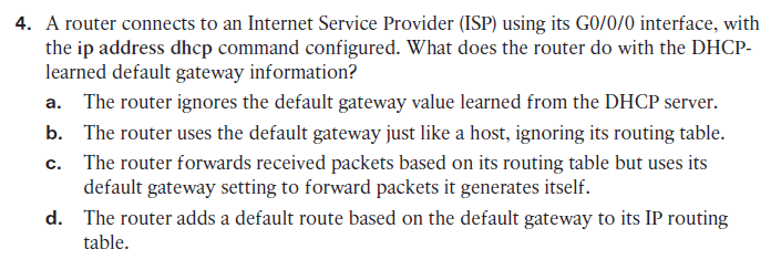 I think they mean gateway by default router. In which case D would be true as the IP is hardcoded on to the router instead of having a clustering situation configured. Which is what FHRP is